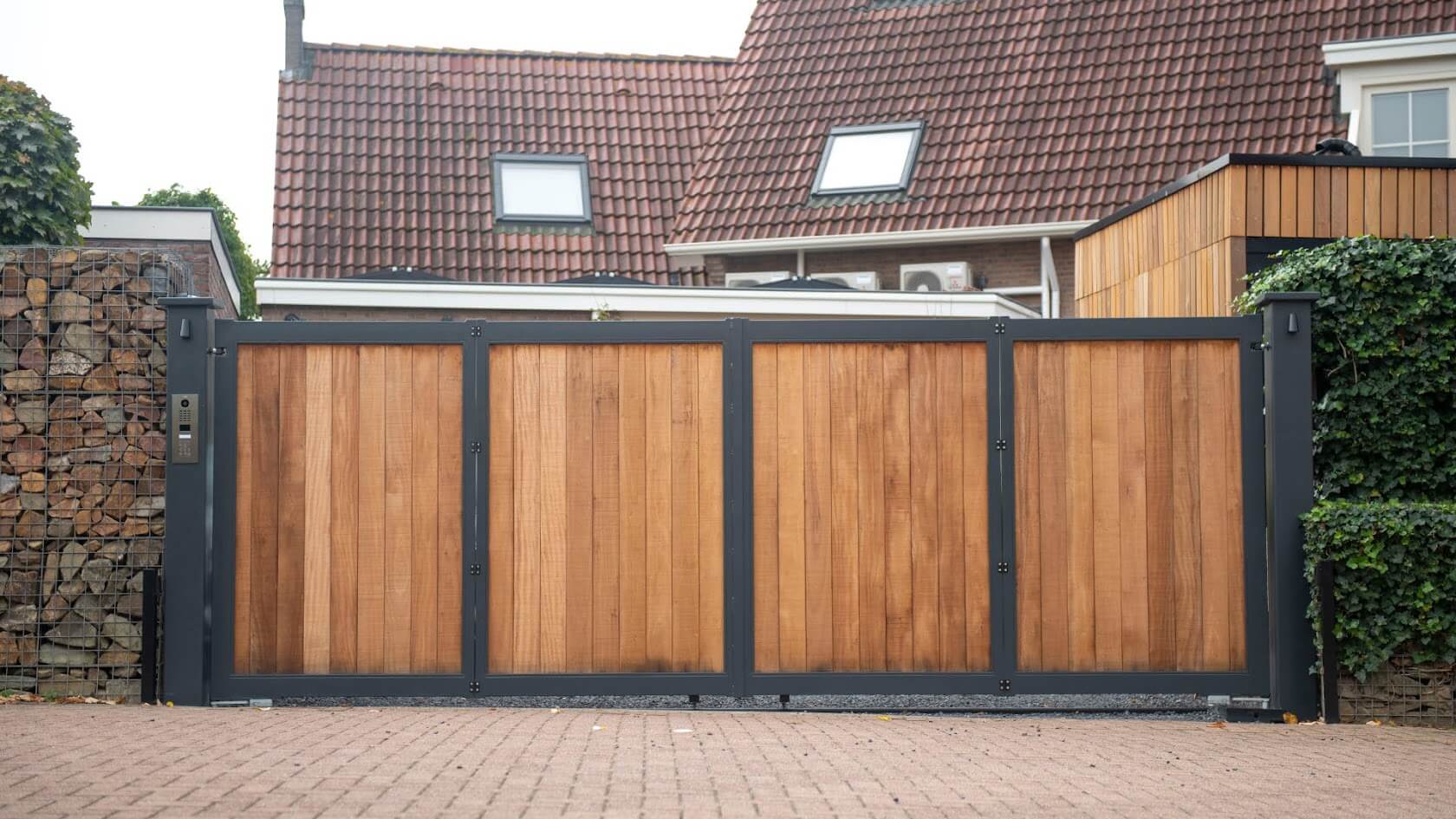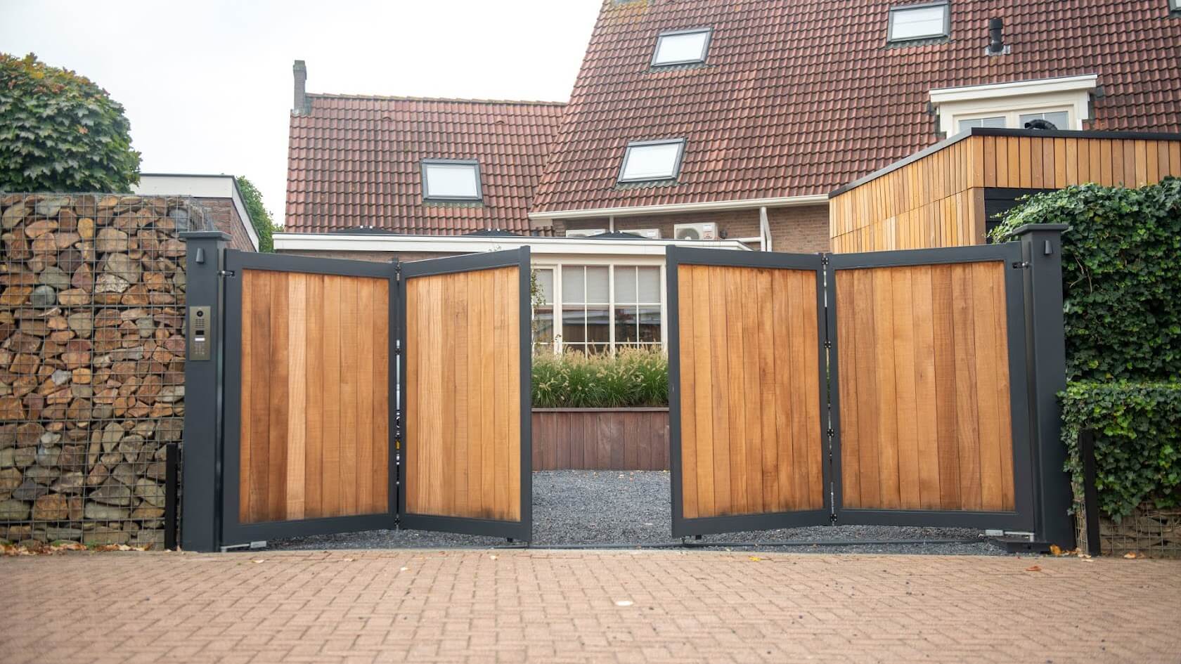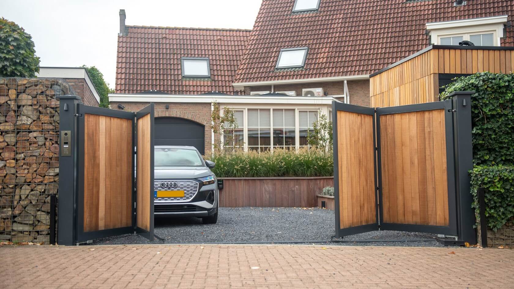 De Napels is een stoere dubbele draaipoort met een robuuste houtvulling in een grof stalen frame. Dit grovere ontwerp benadrukt het krachtige karakter van de poort en maakt hem bijzonder geschikt voor wie houdt van een stevige, opvallende entree. De kokerpalen zorgen voor een solide verankering en maken de constructie extra duurzaam. De poort is elektrisch uitgevoerd en biedt daarmee niet alleen uitstraling, maar ook dagelijks comfort. Beschikbaar in verschillende houtsoorten, dit kan op maat gemaakt worden.