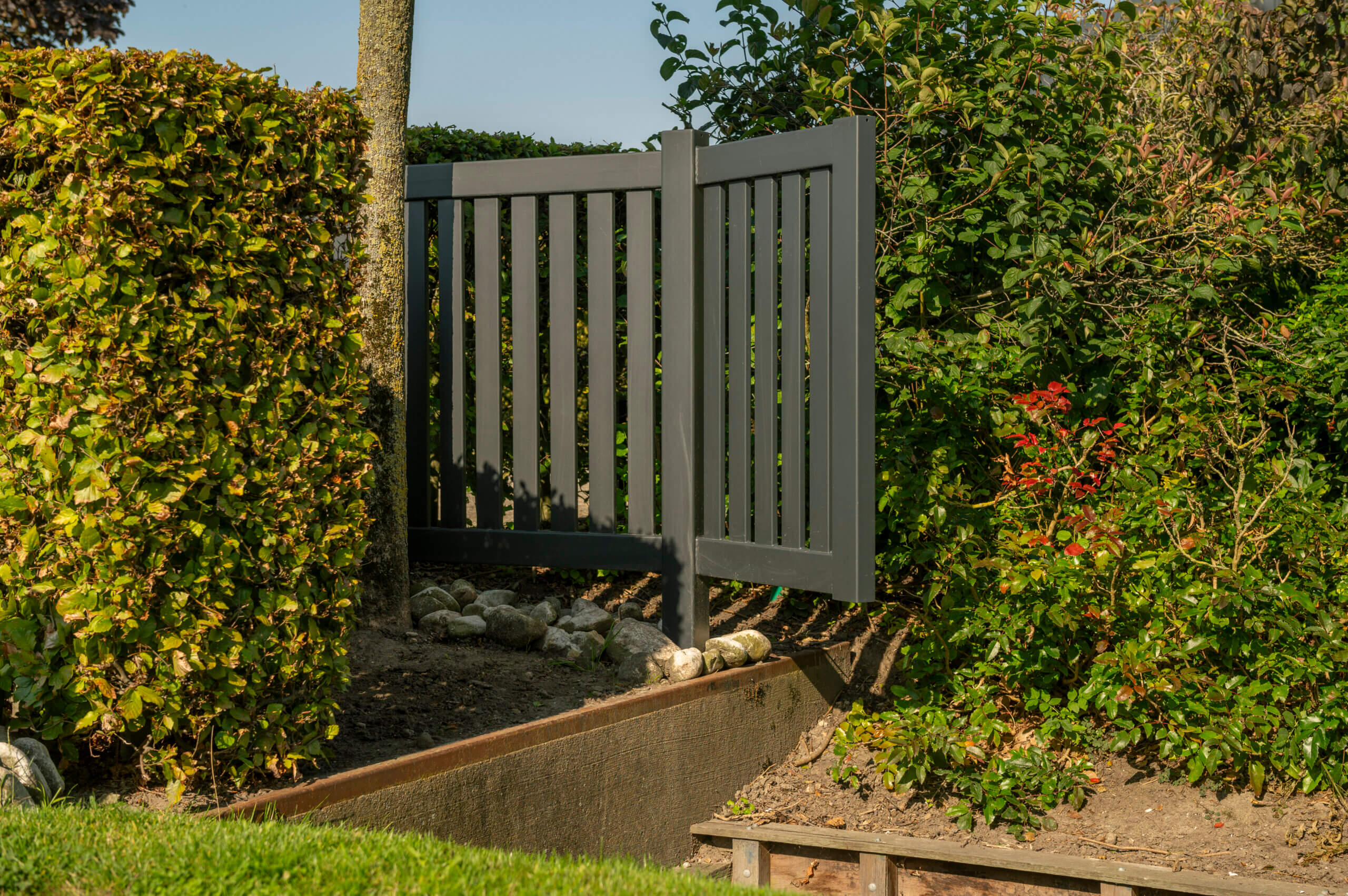 De houtlook draaipoort en het bijpassende houtlook hekwerk zijn ontworpen voor een optimale balans tussen esthetiek en duurzaamheid. De poort is gepoedercoat in RAL 7021 TEXT (zwartgrijs met structuur) voor een robuuste afwerking. Het houtlook design combineert de visuele warmte van hout met de stevigheid van staal, en de kleurkeuze maakt van de poort een echte blikvanger voor de oprit. Dit maatwerkontwerp is niet alleen fraai, maar ook functioneel, doordat het een effectieve afscheiding vormt voor de oprit.