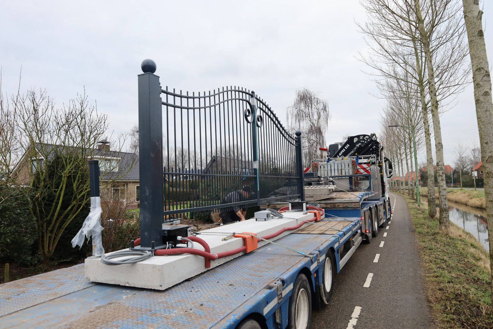 Een ander voordeel is de efficiënte installatie. De poort wordt als een compleet, gebruiksklaar element naar de locatie vervoerd. Hierdoor blijft de overlast op locatie beperkt, wat niet alleen prettig is voor de klant, maar ook zorgt voor een snelle en soepele afronding van het project. Bovendien waarborgt het prefab proces een optimale afwerking en maatvoering, waardoor de poort perfect aansluit bij de rest van het hekwerk en het terrein.
