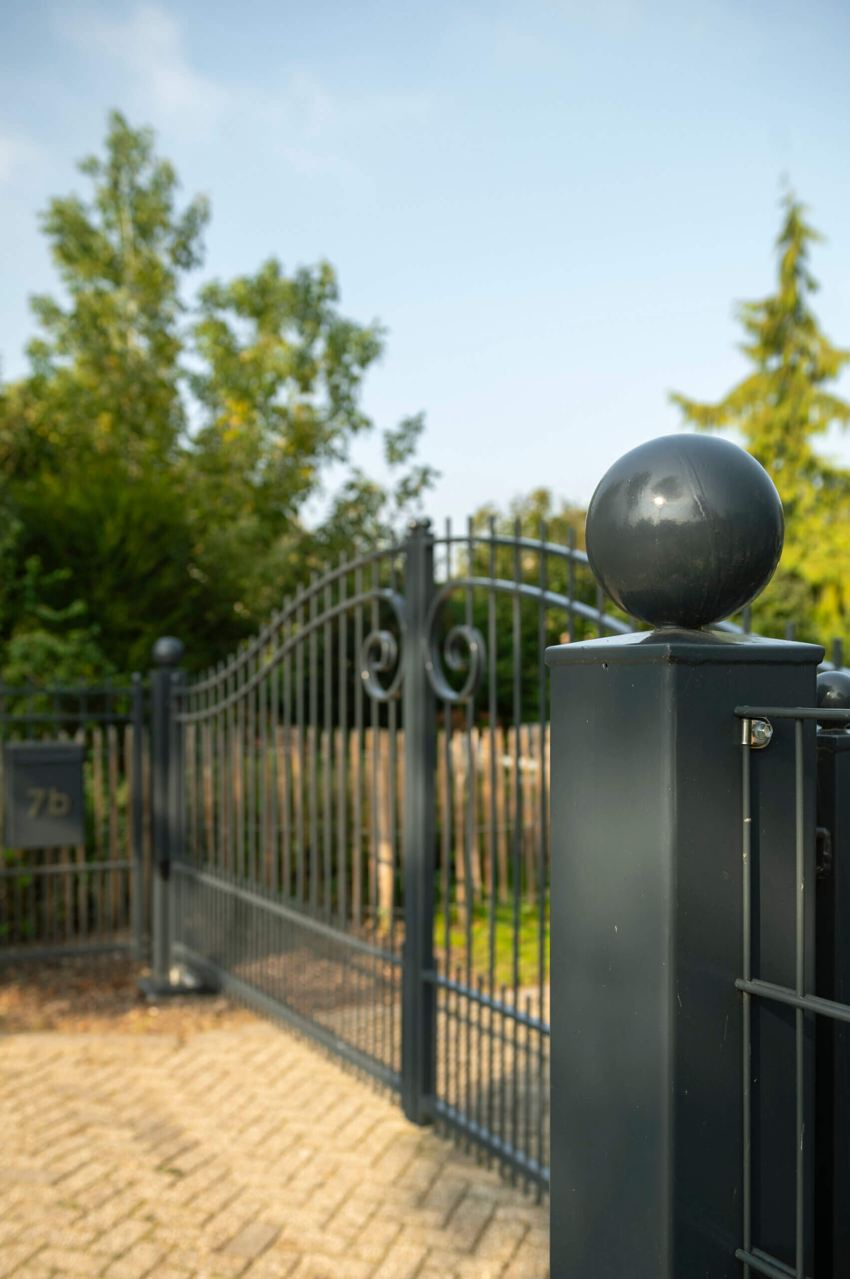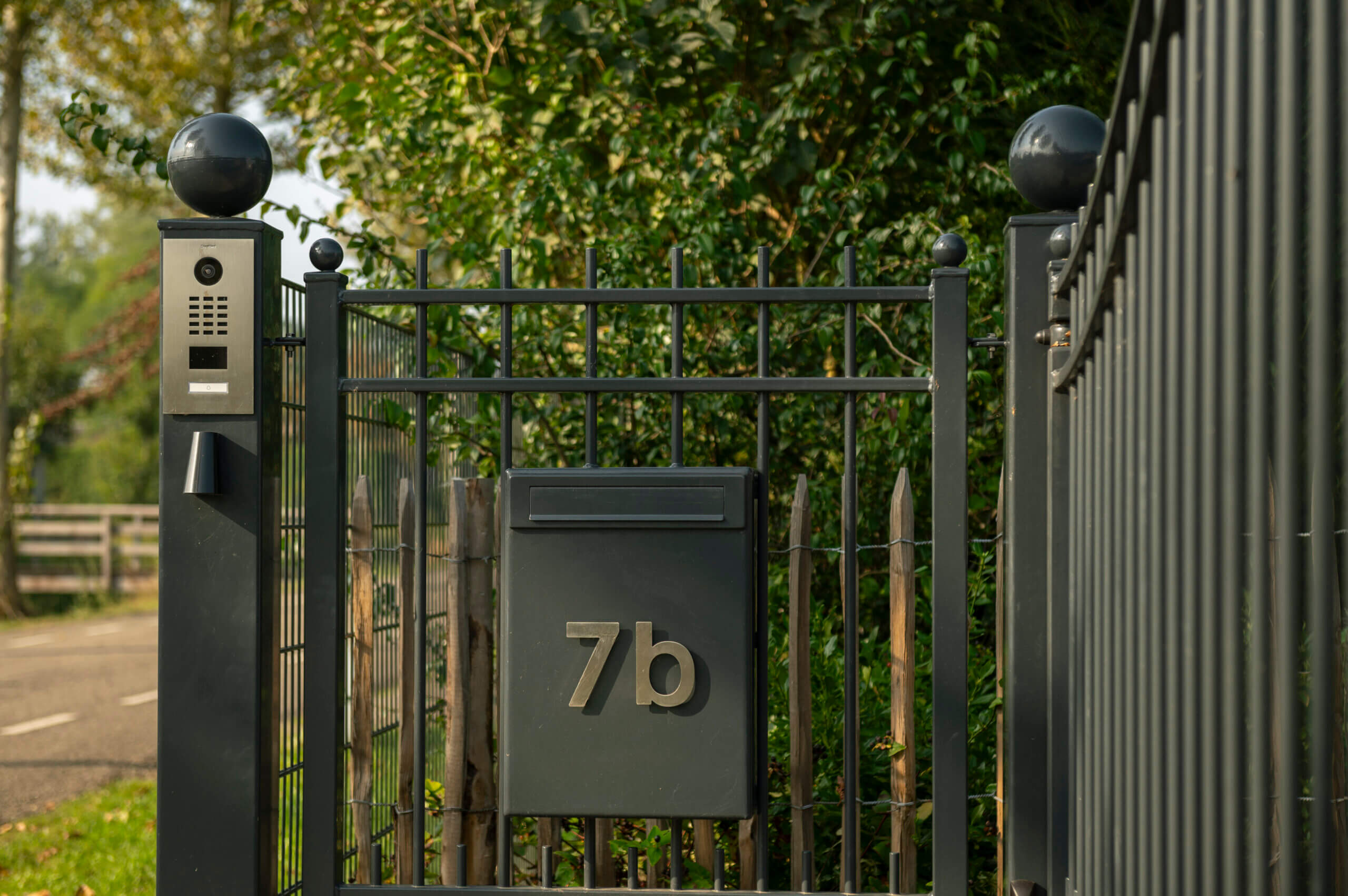 In het hekwerk is een vierkante op maat gemaakte brievenbus verwerkt, met een subtiel RVS huisnummer (7b). Twee led spots, geschakeld via een schemerschakelaar, verlichten de dubbele poort en zorgen voor een uitnodigende entree bij avondschemer.